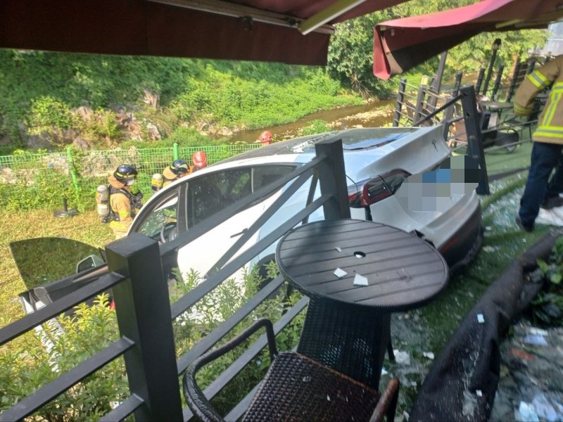 (용인=뉴스1) 김기현 기자 = 14일 오후 3시 10분쯤 경기 용인시 수지구 고기동 한 카페로 테슬라가 돌진하는 사고가 발생했다.