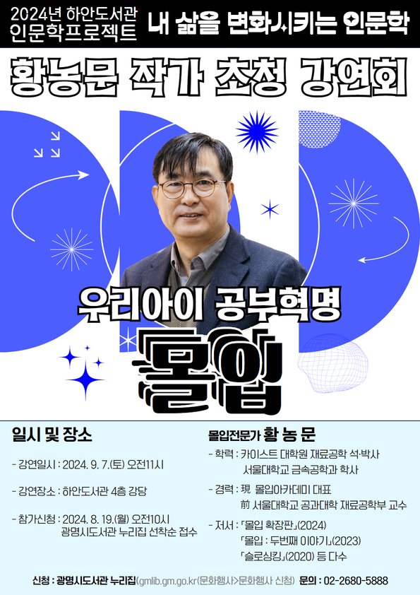 [광명=뉴시스] 문영호 기자 = 경기 광명시 하안도서관이 내달 7일 도서관 강당에서 ‘우리아이 공부혁명, 몰입’이라는 주제로 황농문 교수 초청 강연회를 개최한다.