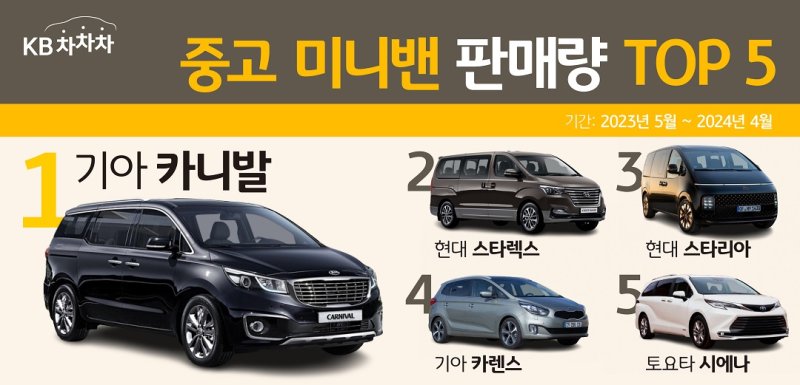 2위부터 5위까지는 현대 스타렉스, 현대 스타리아, 기아 카렌스, 토요타 시에나 순으로 나타났다.