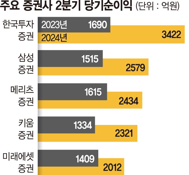 한국투자증권이 3422억원으로 가장 좋은 성적을 거뒀다. 전년동기 대비 102.48% 증가했다. '전통의 기업금융(IB) 강자' 답게 기업공개(IPO), 주식자본시장(ECM), 채권자본시장(DCM) 등 전 부문에서 고른 성과를 냈다. 다음으로 삼성증권(2579억원), 메리츠증권(2434억원), 키움증권(2312억원), 미래에셋증권(2012억원), NH투자증권(1972억원) 순이었다. 영업이익도 지난해보다 크게 확대됐다. 10개 증권사의 합산 실적은 2조3582억원으로 전년동기(1조6028억원)에 비해 47.13% 신장했다. 거래대금과 서학개미가 크게 증가하면서 브로커리지(위탁매매) 실적이 호조를 보인 덕분으로 풀이된다. 특히 미래에셋증권, 한국투자증권, NH투자증권, 삼성증권, 키움증권 등 주요 5개 증권사의 올해 2·4분기 해외주식 수수료 수익은 1988억원으로 지난해 같은 기간(1274억원) 대비 56.04% 확대됐다. 하반기에도 기준금리 인하 기대감과 기업 밸류업 프로그램 덕에 증시 활황이 예상되면서 실적 성장세가 이어질 전망이다. 영업이익 1조 클럽에 가입할 것으로 예상되는 증권사는 한국투자증권이 첫손가락에 꼽힌다. 금융정보업체 에프앤가이드에 따르면 한국투자증권의 올해 영업이익은 1조1481억원으로 전년동기 대비 39.95% 증가할 전망이다. 삼성증권은 43.34% 늘어난 1조623억원, 미래에셋증권은 100.08% 증가한 1조425억원으로 각각 예측된다.