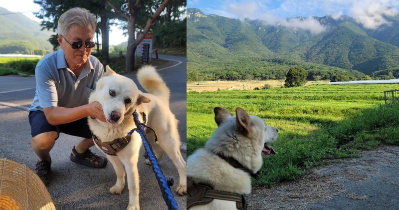 사진에서 문 전 대통령은 선글라스를 끼고 반바지에 샌들 차림으로 반려견 다운이의 목을 쓰다듬고 있다. 또 다른 사진에는 다운이가 먼 산을 보고 있는 뒷모습을 담았다.