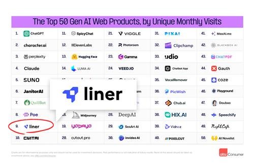 (서울=연합뉴스) 노재현 기자 = 인공지능(AI) 스타트업 '라이너'(LINER)는 세계 최대 벤처캐피털(VC) 앤드리슨호로위츠가 최근 발표한 '생성형 AI 소비자 앱 톱 100'의 웹 서비스 부문에서 자사 검색 서비스가 9위를 기록했다고 23일 밝혔다.