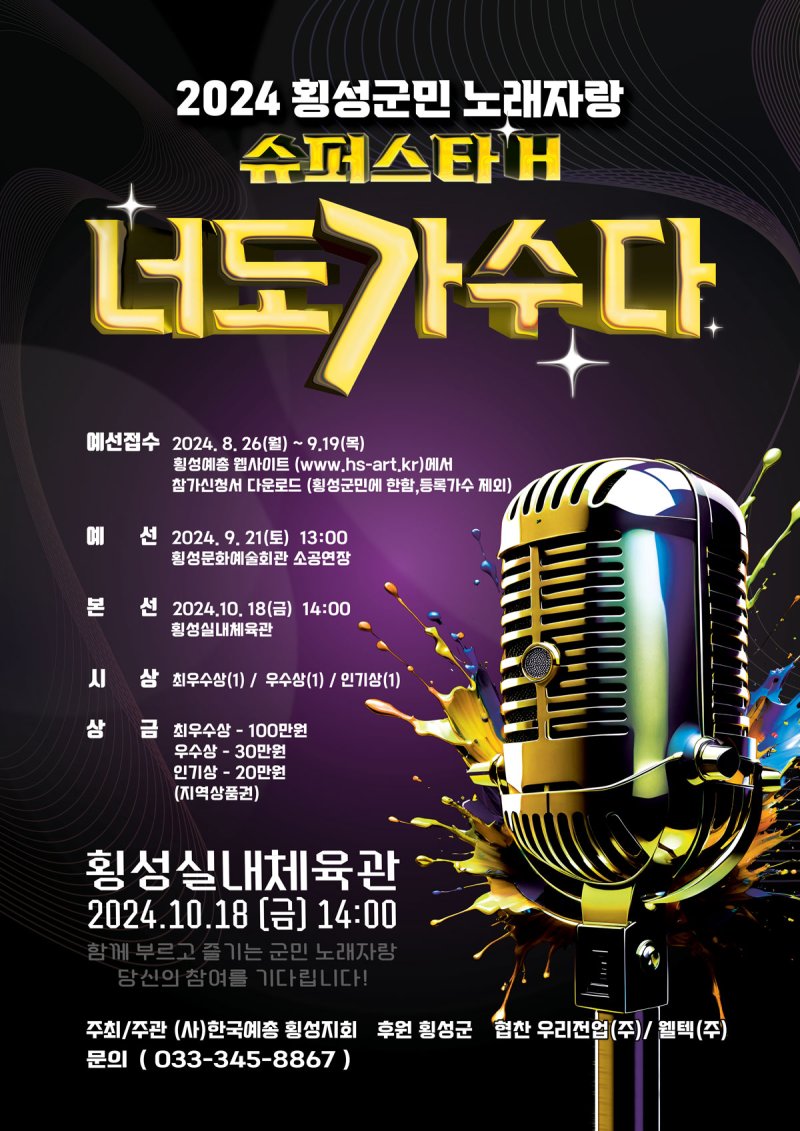 [횡성=뉴시스]이덕화 기자 = 강원 횡성군은 아마추어 대표 가수를 뽑는 축제형 음악경연 '슈퍼스타 H, 너도 가수다, 2024 군민 노래자랑'을 개최한다고 26일 밝혔다.