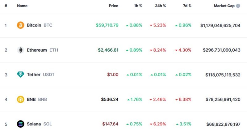 28일 오전 8시 40분 현재 글로벌 코인 시황 중계사이트인 코인마켓캡에서 비트코인은 24시간 전보다 5.23% 급락한 5만9710달러를 기록하고 있다.