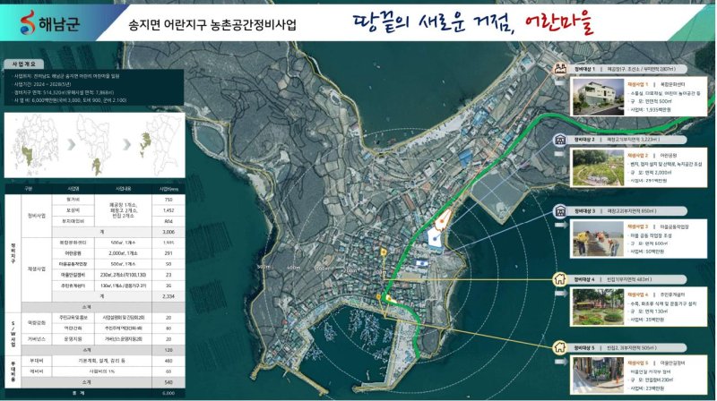 [해남=뉴시스] 박상수 기자 = 전남 해남군은 농식품부가 주관한 2024년 농촌공간정비사업 2차 공모에 송지면 어란지구가 선정돼 국비 30억원을 포함, 총 60억원 사업비를 확보했다고 29일 밝혔다.
