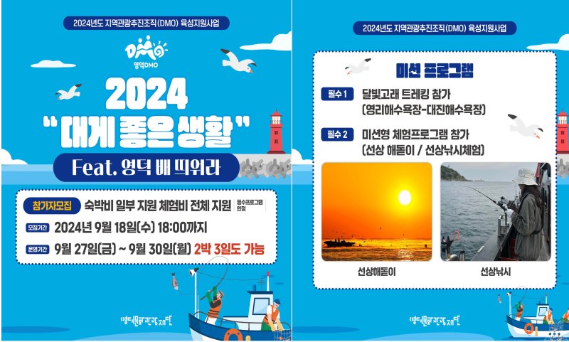 체류형 여행프로그램으로 9월27~30일 3박4일 또는 2박3일 일정으로 진행되며, 배에서 일출 촬영과 바다낚시를 즐길 수 있다.