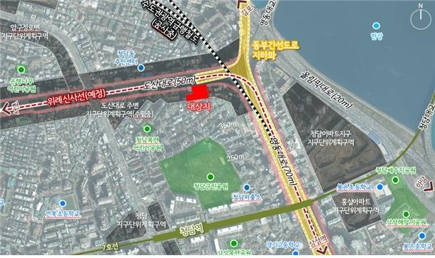 이 지역은 도산대로변 노선형 상업지역으로 일대에 삼성역 복합환승센터와 위례신사선, 동부간선도로 지하화 등 다양한 광역교통망 사업이 예정돼 개발 잠재력이 큰 곳이다.