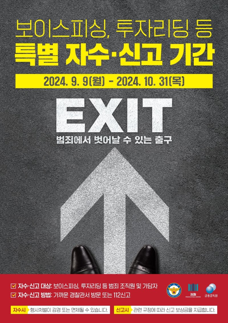국수본은 또 대검찰청, 금융감독원 등 관계 기관과 긴밀하게 협업해 자수·신고를 적극적으로 독려하기 위한 대국민 홍보를 추진한다. 특히 인터폴은 보이스피싱, 투자리딩방 등과 관계가 깊은 중국, 필리핀, 캄보디아 등 주요 5개국을 선정해 현지에서 즉각적으로 접수할 수 있는 전용 자수·신고 창구를 개설할 예정이다.