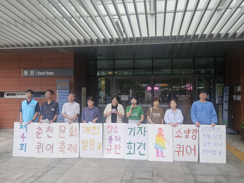 춘천퀴어문화축제조직위는 12일 오전 춘천시청 앞에서 기자회견을 갖고 “춘천퀴어문화축제가 춘천시에서 매년 장소 허가를 받지 못하는 상황은 차별과 분명 닿아있다”며 “ 모든 시민에게 개방되어야 하는 공원임에도 허가를 내주지 않는 것은 또 하나의 배제를 드러낼 뿐”이라고 강조했다.