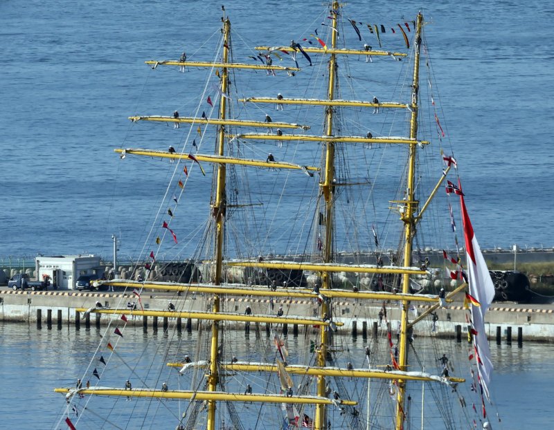 [부산=뉴시스] 하경민 기자 = 인도네시아 해군 실습선 '비마수치함'(KRI BIMA SUCI·2350t)이 13일 오전 부산 남구 해군작전사령부 부산작전기지에 입항하고 있는 가운데 승조원들이 돛대 위에 도열하고 있다. 비마수치함은 길이 111m, 폭 13.5m 규모의 대형 범선으로, 이번 부산 방문은 2019년에 이어 2번째다. 2024.09.13. yulnetphoto@newsis.com [서울=뉴시스] 류현주 기자 = 인도네시아 해군 실습선 '비마수치함'(KRI BIMA SUCI·2350t)이 13일 오전 부산 남구 해군작전사령부 부산작전기지에 입항하고 있는 가운데 승조원들이 돛대 위에 도열하고 있다.