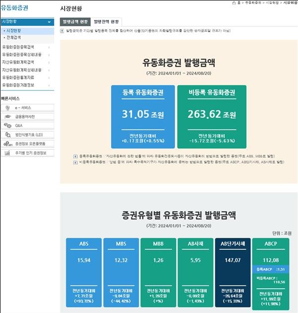 예탁원에 따르면 유동화증권 통합정보시스템에 등록된 유동화증권 발행내역은 총 2442건(등록유동화 97건·비등록유동화 2325건)으로 집계됐다.