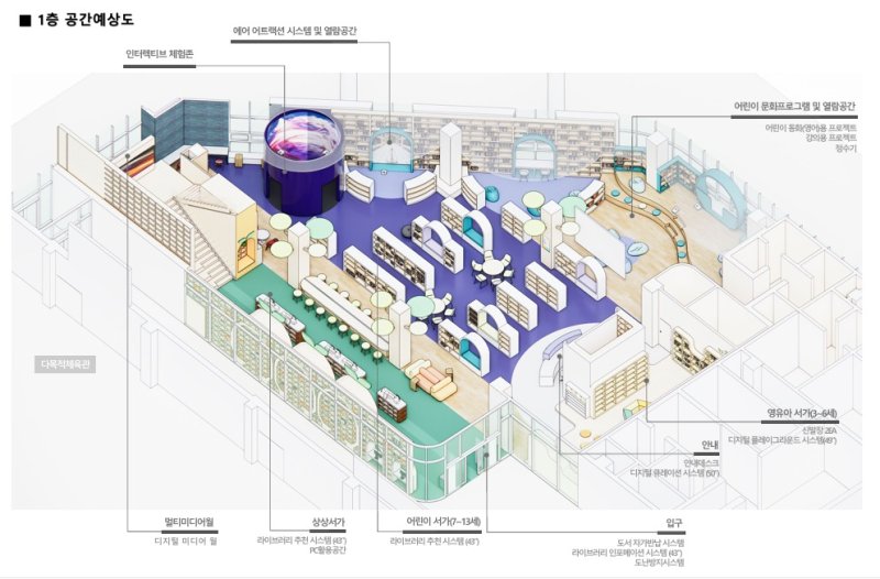 이곳 도서관은 자료실뿐만 아니라 인터렉티브 체험존과 같이 독서와 교육, 문화가 결합한 개방형 열람 공간으로 구성해 개관을 준비하고 있다.