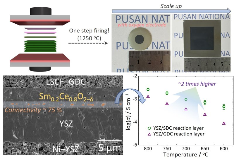 이 기술은 전해질 소재로 '이트리아(Y₂O₃) 안정화 지르코니아(YSZ)'와 'Sm(사마륨)이 도핑된 세리아(SDC)'를 적용한 이중층 구조를 사용해 고온 동시 소결 공정을 극적으로 단순화하고 전지 성능을 더욱 향상시킨다.