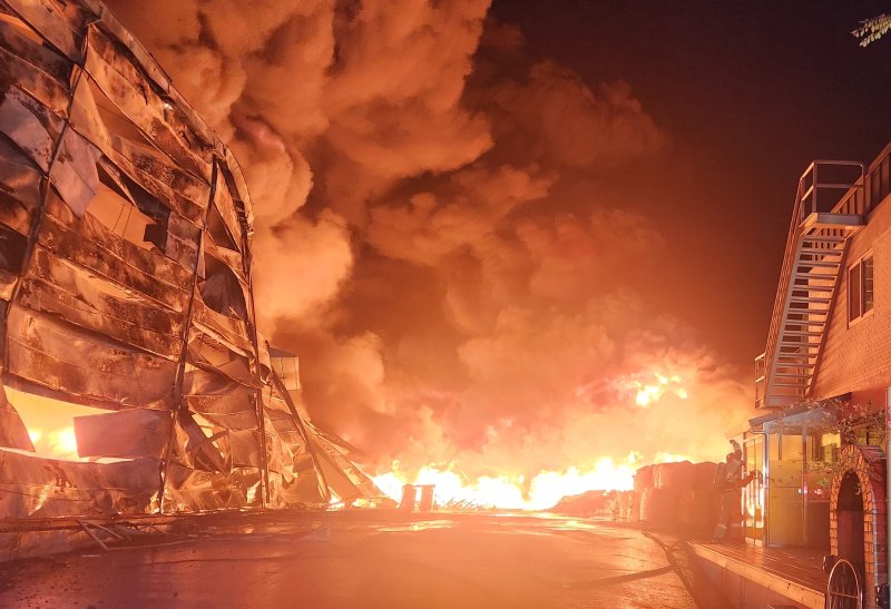 (군산=뉴스1) 장수인 기자 = 23일 오전 1시 57분께 전북 군산시 오식도동 한 플라스틱 제조 공장에서 불이 났다.