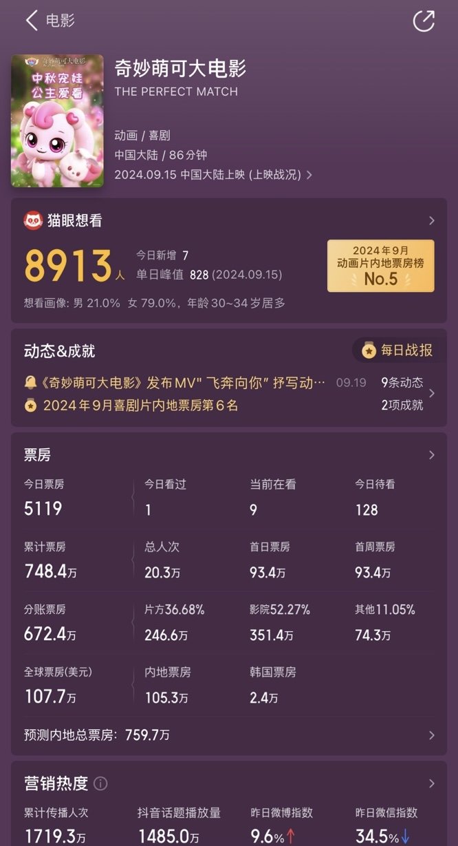 중국에서는 한국과 달리 영화를 관람한 인원의 수가 아닌 티켓 가격의 총합을 주요 지표로 삼고 있다. 해당 금액을 중국의 평균 티켓 가격인 약 35위안으로 나누면 21만명 정도의 관객 수가 영화 '사랑의 하츄핑' 관람을 위해 영화관에 찾은 것으로 보인다고 회사 측은 설명했다.