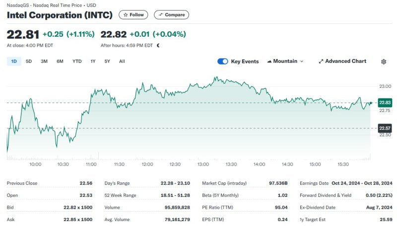 24일(현지시간) 뉴욕증시에서 인텔은 전거래일보다 1.11% 상승한 22.81달러를 기록했다.
