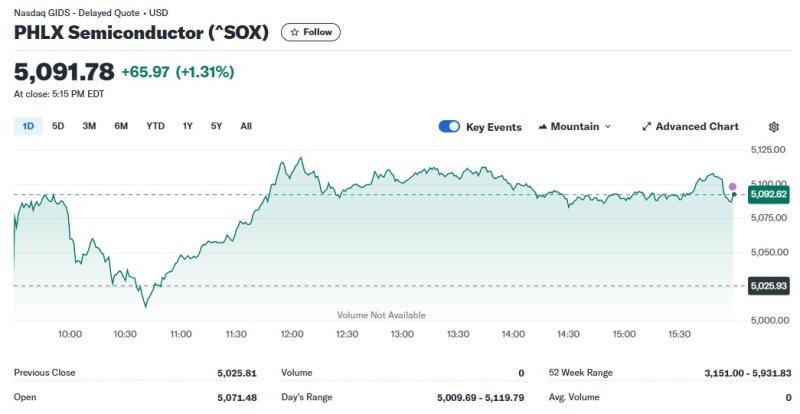 24일(현지시간) 뉴욕증시에서 반도체지수는 전거래일보다 1.31% 상승한 5091.78포인트를 기록했다.