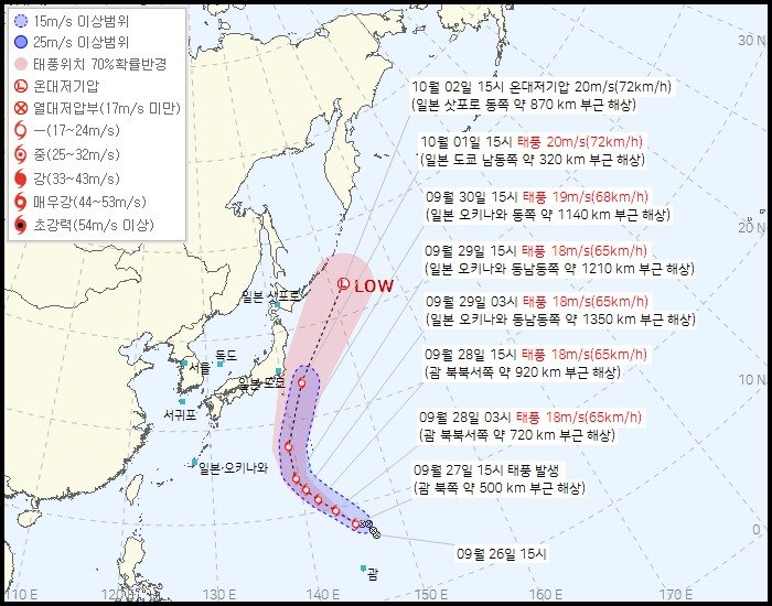 이 태풍은 북진과 북서진을 거듭하며 10월 1일 오후 도쿄 먼바다를 지나친 뒤 북동진해 10월 2일쯤 소멸할 것으로 예보됐다.