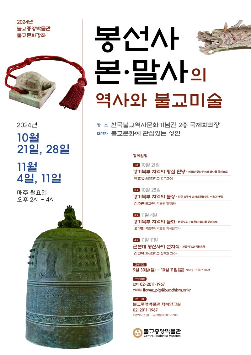 10월28일에는 심주완 불교중앙박물관 행정관이 '경기북부 지역의 불상'을 주제로 파주 보광사 삼세오존불상의 이운과 봉안에 대한 내용을 설명한다.