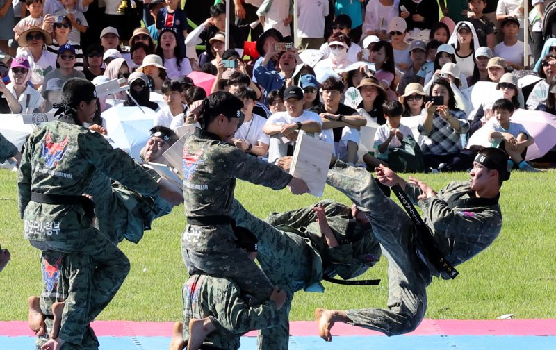 [서울=뉴시스] 김금보 기자 = 건군 76주년 국군의 날을 이틀 앞둔 29일 서울 용산구 용산어린이정원에서 열린 '군 문화 페스타'에서 태권도 시범이 펼쳐지고 있다. 2024.09.29. kgb@newsis.com [서울=뉴시스]김진아 김금보 기자 = 건군 76주년 국군의 날을 이틀 앞둔 29일 서울 용산구 용산어린이정원에서 열린 '군 문화 페스타'에서 태권도와 의장대 시범이 펼쳐졌다.