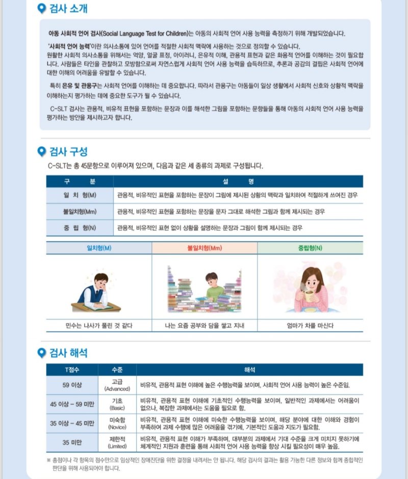 30일 세브란스병원에 따르면 아동이 사회적 의사소통과 사회적 단서와 맥락 파악을 성공적으로 수행하려면 은유적인 관용구를 잘 이해해야 한다. 이날 출판된 C-SLT는 국내 최초로 개발된 것으로 검사 항목에 한국 사회·문화적 상황을 반영해 학령기 아동의 발달 수준에 맞는 관용 어구 사용 능력을 정밀하게 평가한다.