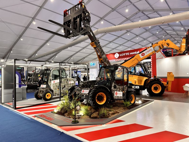 롯데렌탈은 산업장비 렌탈 전문 브랜드인 '롯데비즈렌탈'의 전반적인 사업 소개와 함께, 세계 3대 산업장비 제조사인 영국 JCB의 산업장비 텔레핸들러와 텔레트럭, 측정기 장비를 전시한다. 텔레핸들러는 크레인과 지게차의 장점을 결합한 다목적 장비다.