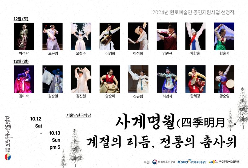 보훈무용예술협회는 오는 12~13일 서울 필동 서울남산국악당에서 '사계명월-계절의 리듬, 전통의 춤사위'를 공연한다고 밝혔다. 협회가 주최하고 문화체육관광부, 국민체육진흥공단, 한국문화예술위원회가 후원하는 공연이다.