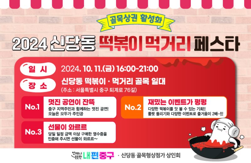 행사 당일 오후 4시부터 9시까지 신당동 떡볶이·먹거리 골목 일대(중구 퇴계로 76길)는 차 없는 거리가 조성된다.