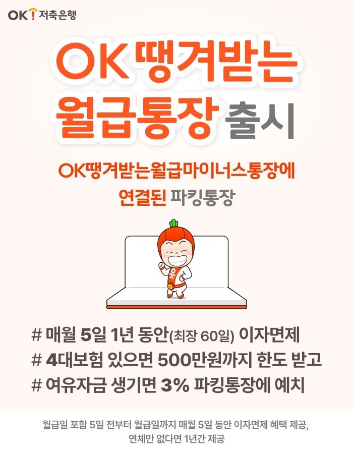 특히 OK땡겨받는월급마이너스통장의 경우 OK땡겨받는월급통장을 개설한 고객에 한해 가입할 수 있으며, 월급일 포함 5일 전부터 월급일까지 매월 5일 동안(1년 최장 60일) 이자 면제 혜택을 받을 수 있다.