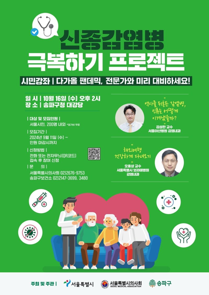 (서울=연합뉴스) 정준영 기자 = 서울 송파구(구청장 서강석)는 지역 특성을 고려한 맞춤형 시민강좌 '신종감염병 극복하기 프로젝트'를 오는 16일 오후 2시 구청 대강당에서 개최한다고 11일 밝혔다.