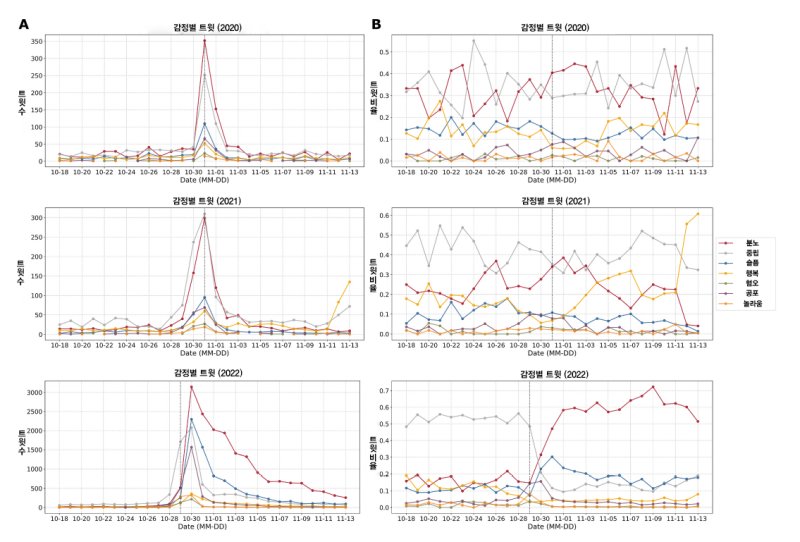 연구팀은 2020년부터 이태원 참사가 발생한 2022년까지 3년 동안 할로윈 축제 전후 2주(10월18일~11월13일) 동안 국내에서 작성된 엑스(X·옛 트위터)의 트윗 중 ‘이태원’이라는 키워드를 포함하고 있는 트윗을 대상으로 딥러닝 기반 감정분석 모델인 RoBERTa를 활용해 트윗들을 7개의 감정 카테고리(분노·슬픔·행복·혐오·공포·놀라움·중립)로 분류했다. 이후 날짜별로 감정별 트윗 수와 비율을 계산해 연도별 차이를 분석해 재난이 대중의 감정에 미친 영향을 분석했다.