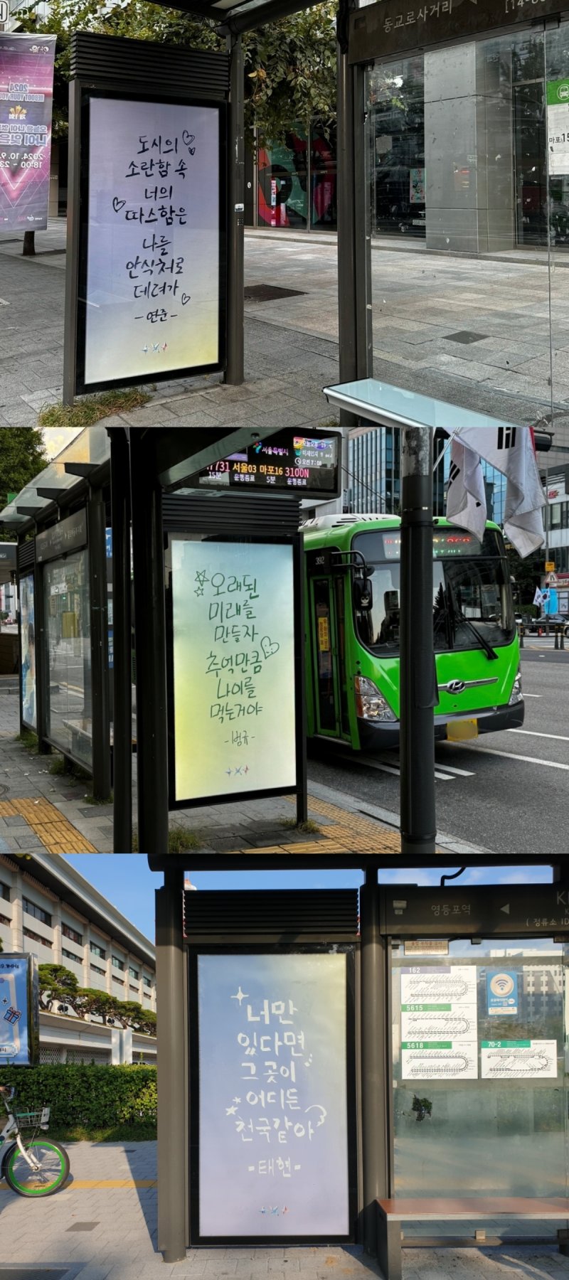 투모로우바이투게더의 도심 속 공개 고백 역시 눈길을 끈다. 멤버들은 버스 정류장과 서울 주요 시내를 지나는 버스에 직접 쓴 손 글씨 광고를 게재했다. 광고에는 "도시의 소란함 속 너의 따스함은 나를 안식처로 데려가" "오래된 미래를 만들자 추억만큼 나이를 먹는 거야" "너만 있다면 그곳이 어디든 천국 같아" 등의 문구가 적혀 있다.