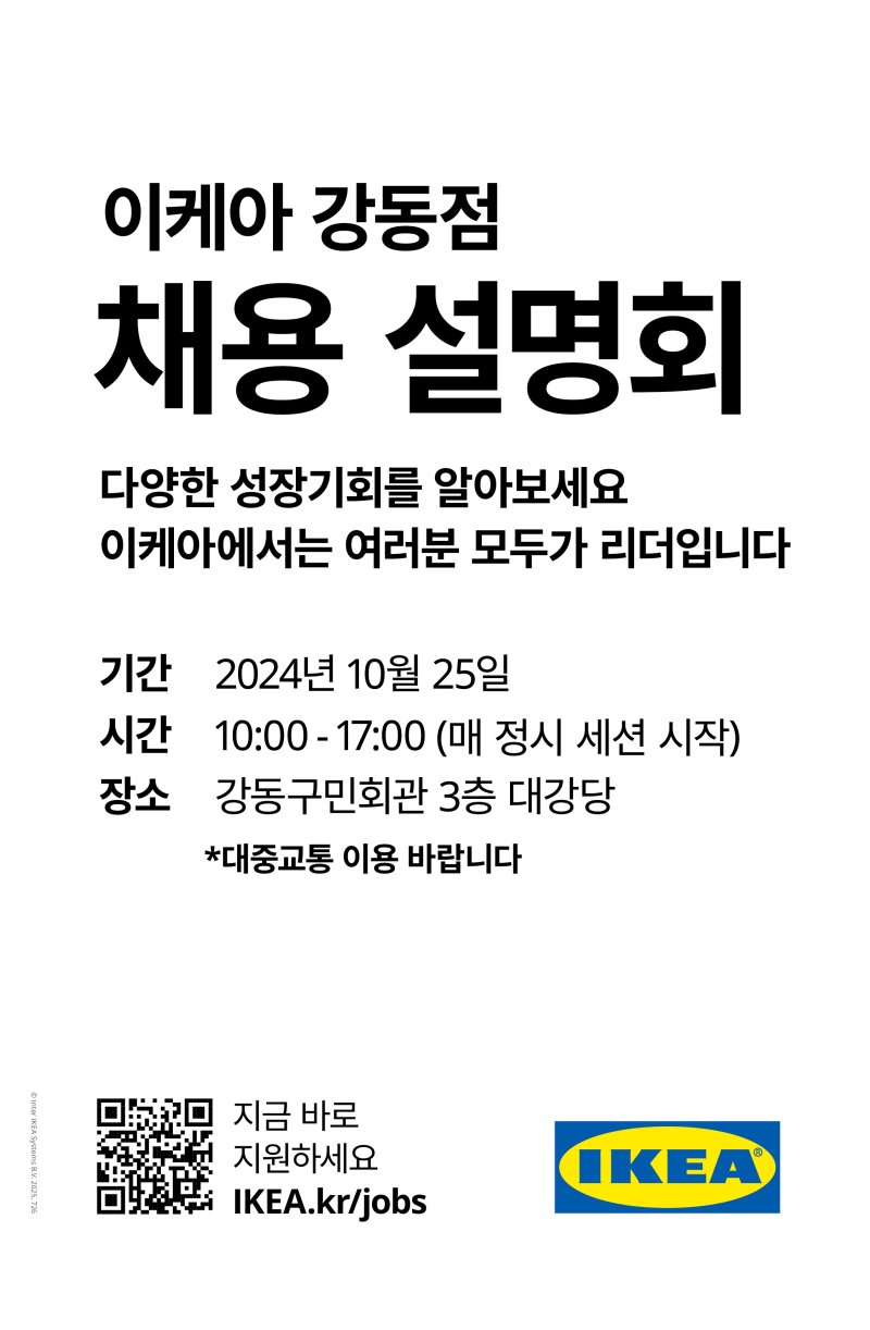 채용 설명회는 누구나 별도의 사전 등록 없이 참석할 수 있다. 입사 지원은 이달 말부터 이케아 공식 채용 사이트를 통해 진행된다. 채용 설명회 현장에서도 온라인으로 지원서를 접수할 수 있다.