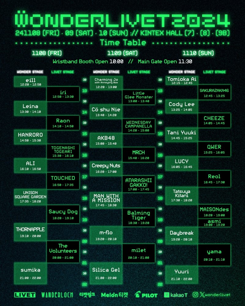 '원더리벳 2024' 타임테이블에 따르면 공연 시간대가 겹치지 않아 당일 출연하는 모든 아티스트의 무대를 라이브로 관람할 수 있도록 구성됐다.
