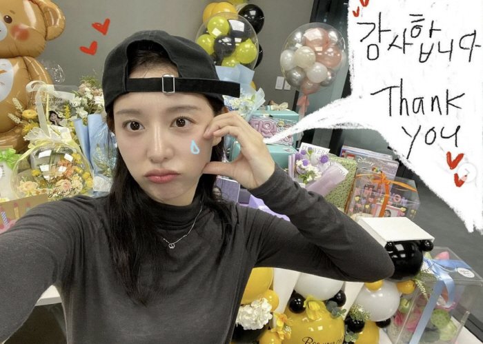 공개된 사진 속에는 세계 각국 글로벌 팬들에게 받은 화려한 선물들이 사무실을 가득 채운 모습이다. 김지원은 수많은 선물 가운데에 서서 포즈를 취하고 있다.