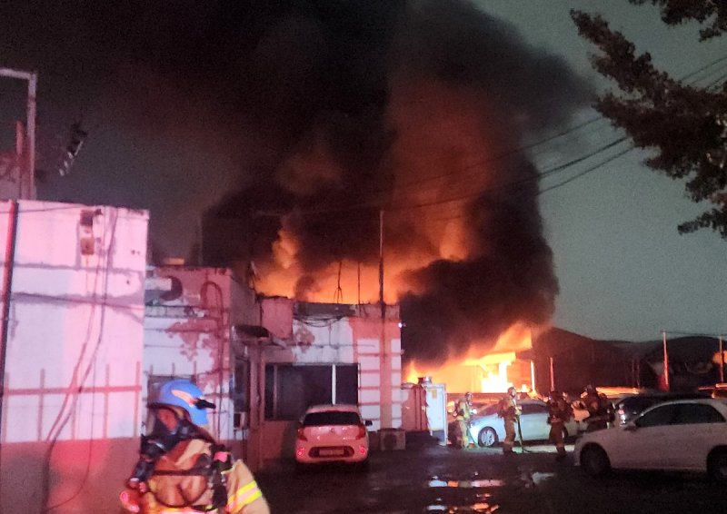 이 불로 인명 피해는 없었으나 공업사 건물과 차량 여러 대가 타고 검은 연기와 불길이 치솟아 현장 접근이 통제됐다.