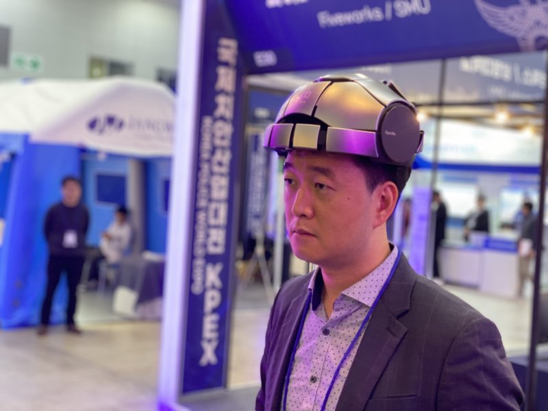 부스 한편에는 머리에 쓰는 AI 뇌파 분석 기반 맞춤형 관리 기기가 놓여있었다. 올해 치안산업대상을 받은 이 기기는 뇌파를 측정해 뇌 질환이나 마약 중독 치료 등에 활용할 수 있다.