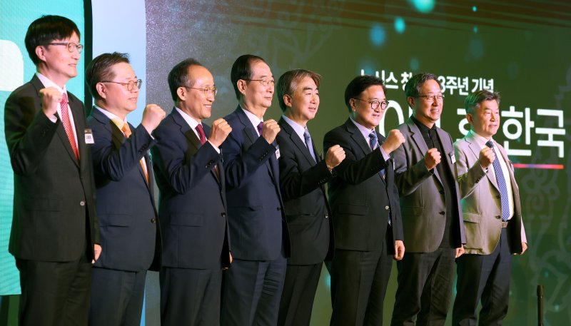 [서울=뉴시스] 홍효식 기자 = 염영남 뉴시스 대표이사 등 내빈들이 24일 서울 종로구 광화문 포시즌스호텔에서 열린 뉴시스 창사 23주년 기념 '2024 뉴시스 포럼 10년 후 한국'에서 기념촬영을 하고 있다.왼쪽부터 김흥종 고려대 교수, 박일준 대한상의 상근부회장, 추경호 국민의힘 원내대표, 한덕수 국무총리, 염영남 뉴시스 대표이사, 우원식 국회의장, 전하진 SDX재단이사장, 정석 서울시립대 도시공학과 교수. 2024.10.24. yesphoto@newsis.com [서울=뉴시스] 류현주 기자 = '2024 뉴시스 포럼 10년 후 한국'이 24일 서울 종로구 포시즌스호텔에서 열렸다. 올해는 '공감의 확장'이라는 주제로 진행된다.