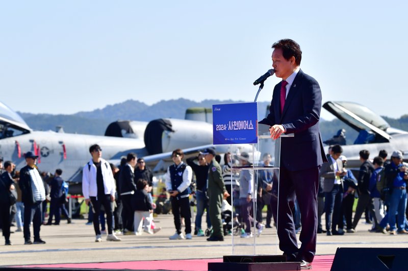 [사천=뉴시스] 차용현 기자 = 24일 오전 경남 사천비행장에서 열린 '2024 사천에어쇼' 개막식에서 박동식 사천시장이 개막선언을 하고 있다. 2024 사천에어쇼는 오는 24일부터 27일까지 사천비행장 일원에서 개최된다. 2024.10.24. con@newsis.com [사천=뉴시스] 차용현 기자 = 24일 오전 경남 사천비행장에서 ‘사천비상-우주항공의 꿈! 우리의 힘으로’라는 주제로 ‘2024 사천에어쇼’가 개막했다.