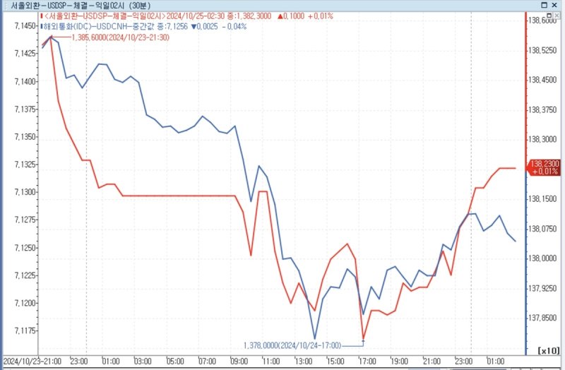 25일(한국시간) 새벽 2시 달러-원 환율을 전장 서울 환시 주간 거래(오전 9시~오후 3시 반) 종가(1,382.10원) 대비 0.10원 상승한 1,382.30원에 거래가 끝났다.
