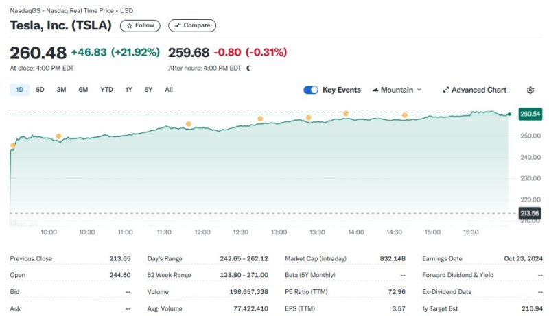 이날 테슬라는 실적 호재에 힘입어 전거래일보다 21.92% 폭등한 260.48달러를 기록했다. 이는 2013년 이후 최고의 일일 상승폭이다. 테슬라는 2013년 5월 24% 급등한 적이 있었다.