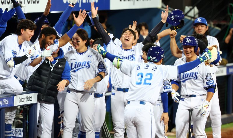 [대구=뉴시스] 전신 기자 = 25일 대구 수성구 대구삼성라이온즈파크에서 열린 2024 KBO 포스트시즌 한국시리즈 3차전 KIA 타이거즈와 삼성 라이온즈의 경기에서 7회말 무사 삼성 김헌곤이 솔로 홈런을 친 뒤 동료선수들과 함께 기뻐하고 있다. 2024.10.25. photo1006@newsis.com [서울=뉴시스]김선웅 김주희 기자 = 익숙한 대구로 돌아오자 '홈런의 팀' 삼성 라이온즈의 방망이도 깨어났다.