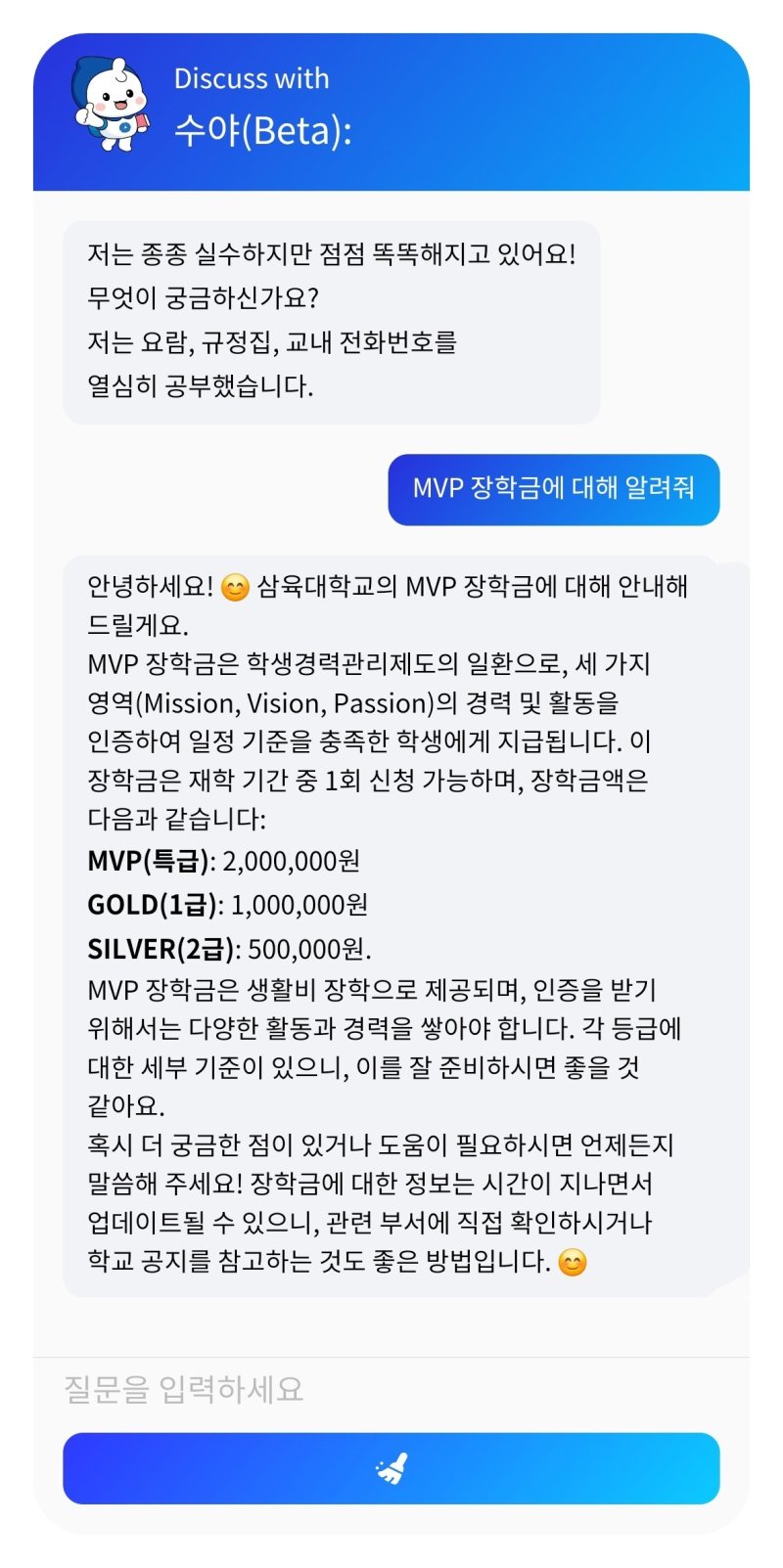 삼육대가 자체 개발한 AI 챗봇 '수봇'(SUBot)은 대학 요람, 규정집, 전화번호 등 홈페이지 데이터를 RAG(검색증강생성) 기술로 처리해 학생과 교직원에게 24시간 맞춤형 응답 서비스를 제공한다.
