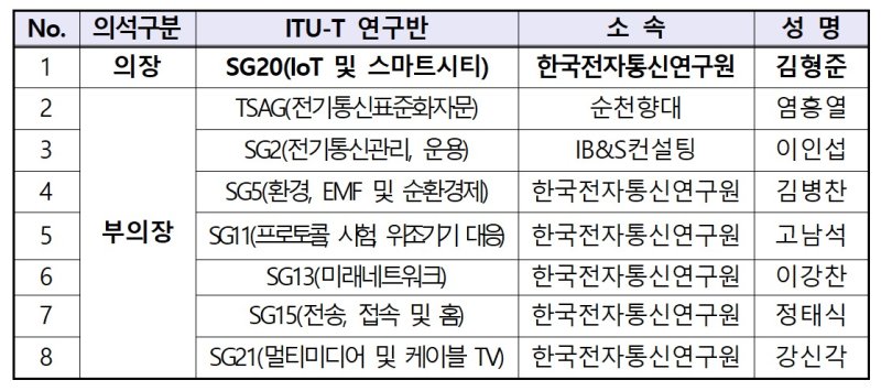 WTSA-24에서 한국은 차기 회기 분야별 연구반 의장단에 후보를 제출해 '사물인터넷 및 스마트시티 연구반'(SG20) 의장 1석과 ITU-T 자문그룹 부의장 등 부의장 7석을 수임해 총 8명의 의장단을 확보했다.
