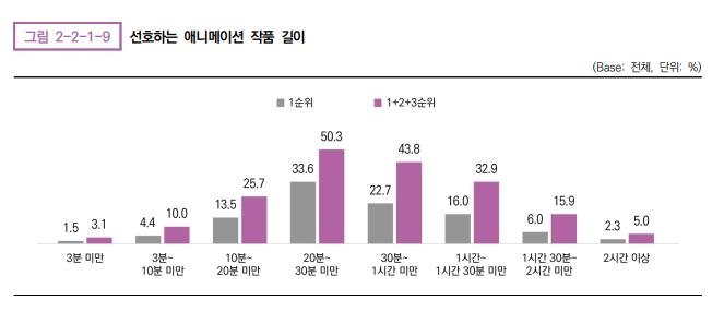 30일 한국콘텐츠진흥원에서 최근 발간한 '2024 애니메이션 산업백서'에 따르면 애니메이션 이용자들이 가장 선호하는 애니메이션 작품 길이는 '20∼30분 미만'(33.6%)인 것으로 나타났다.