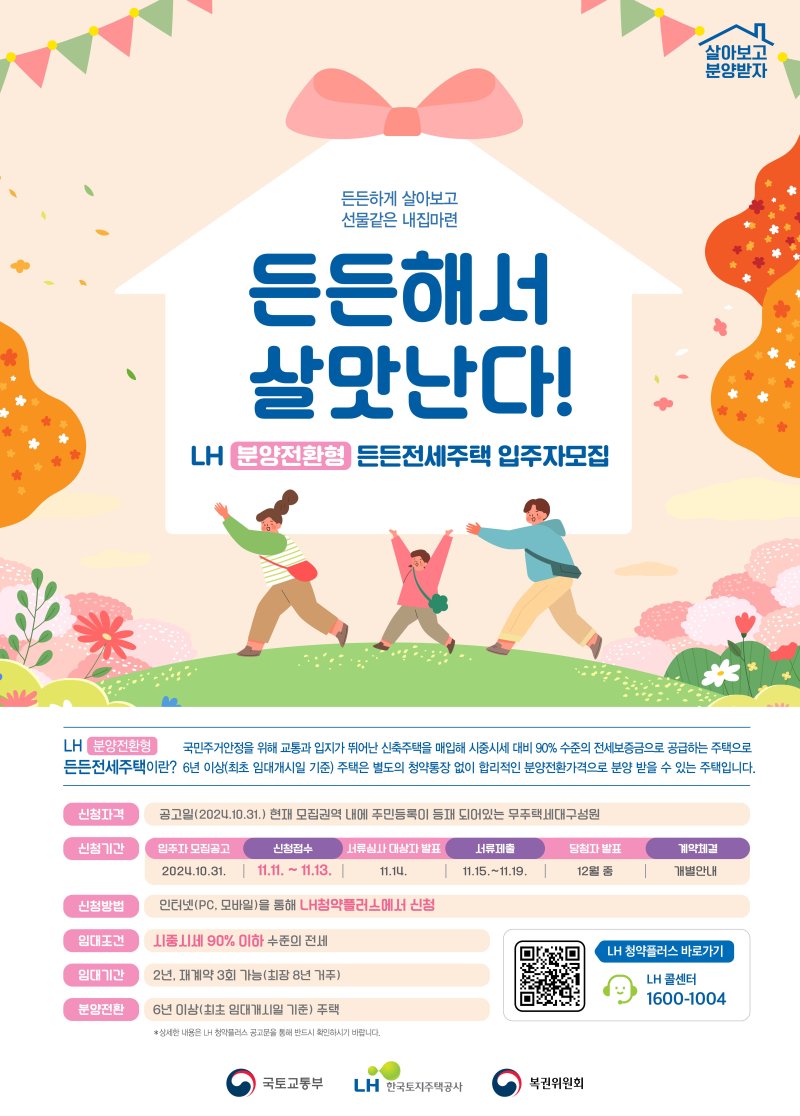 분양전환형 매입임대는 든든전세 유형과 월세형으로 구분해 모집한다. 든든전세유형은 소득·자산요건과 무관하게 시세대비 90% 전세로 공급하고 월세형은 신혼·신생아 매입임대 입주자격을 갖춘 자를 대상으로 공급한다.