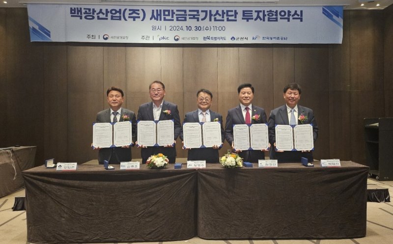 [서울=뉴시스] 김경택 기자 = 종합 화학 신소재 개발 전문기업 백광산업은 새만금개발청과 반도체·디스플레이 핵심소재 제조 시설 건립을 위한 투자협약을 체결했다고 30일 밝혔다.