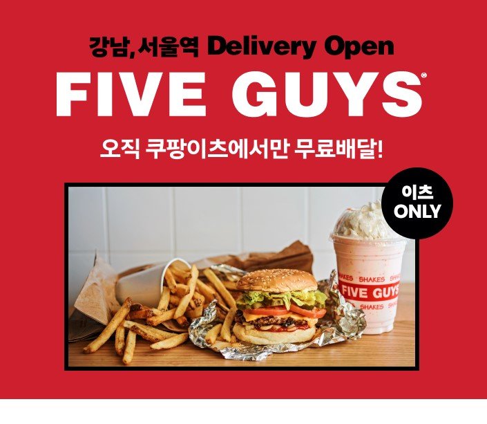 쿠팡이츠 무료배달 서비스는 파이브가이즈 강남점과 서울역점에서 시작되며 향후 전체 매장대상 순차적으로 적용될 예정이다.