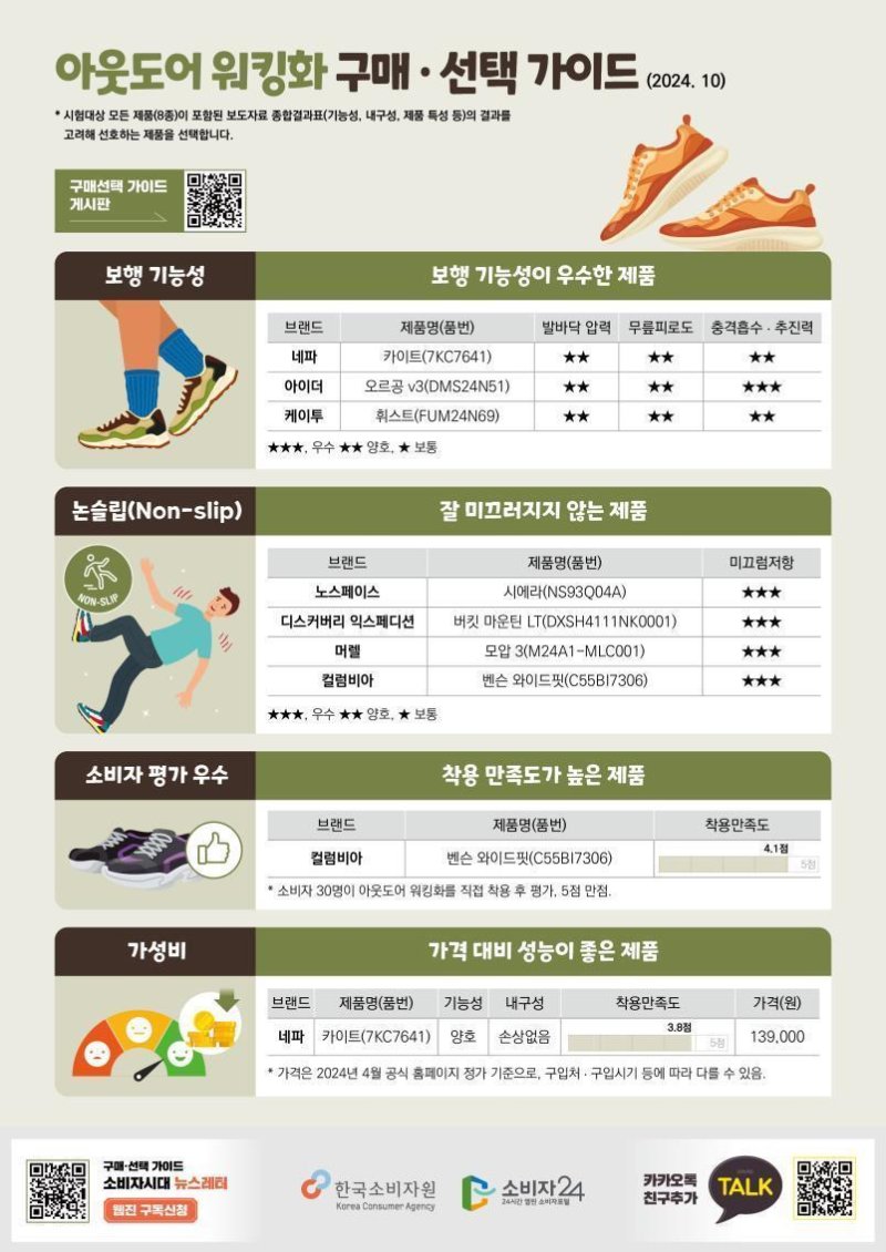 발바닥 압력은 밀레, 무릎피로도는 컬럼비아 제품이 우수했다. 내구성은 네파, 노스페이스 등 제품이 높은 평가를 받았다.