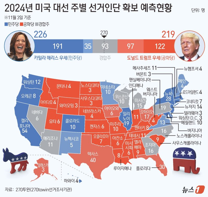 이 시간까지 확보한 누적 선거인단은 트럼프 219명, 해리스 226명이다. 경합주 누적 선거인단은 93명이다.